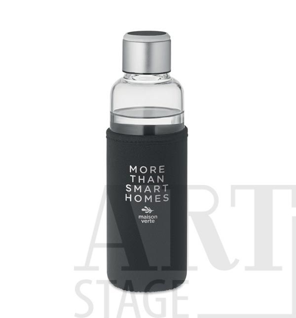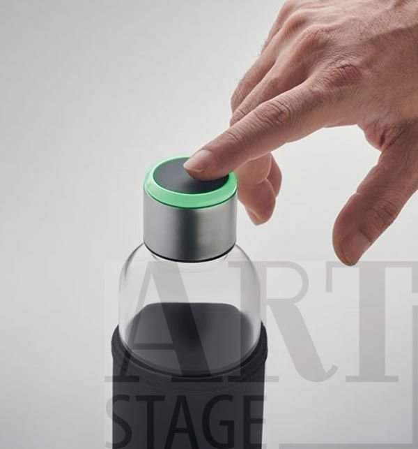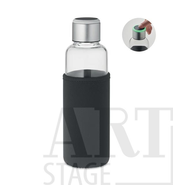 Borosilicate glass steel bottle with hydration reminder in pouch. Sensor light glows every hour reminding you when it is time to drink. Including 1 CR2032 battery. Capacity: 500 ml.