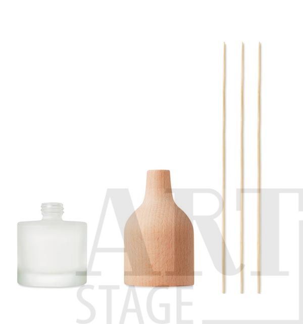 Aroma diffuser with 3 reed sticks. Beech wood top and glass. Fragrance Lily. Capacity 30 ml. As wood is a natural material, the colour per item can vary. Top wood part absorbs/assimilates oil which helps spread fragrance.