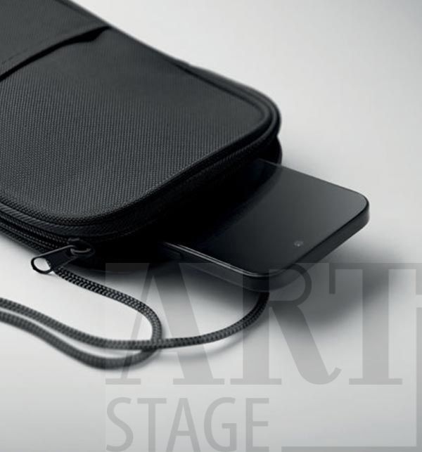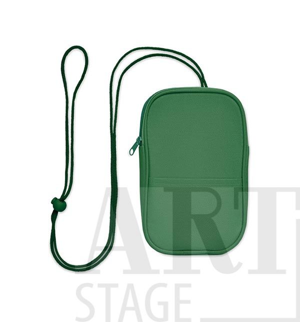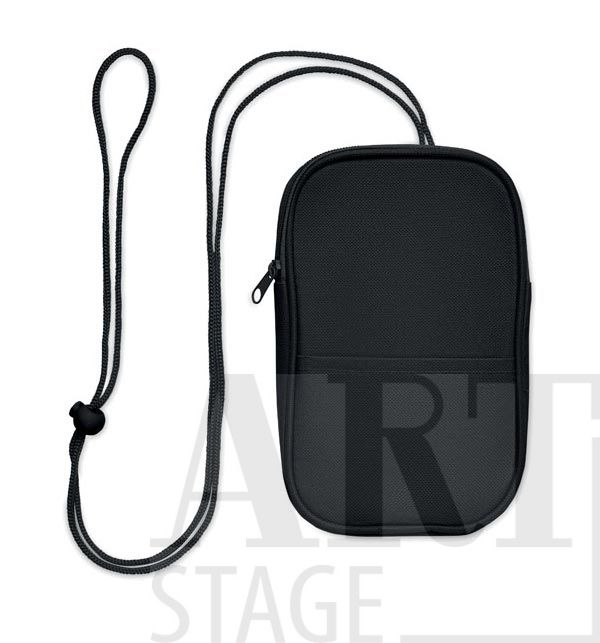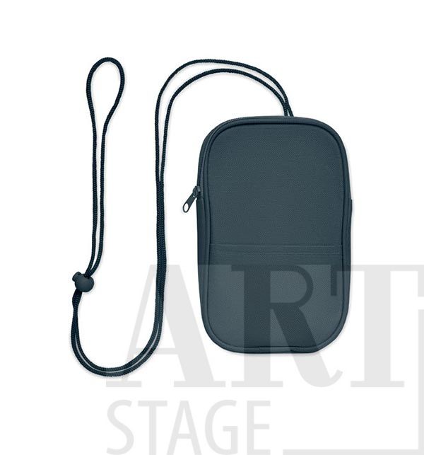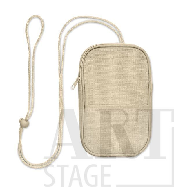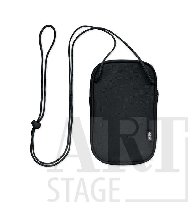 Cross body travel pouch in 600D RPET polyester and 210D RPET lining with cord strap.