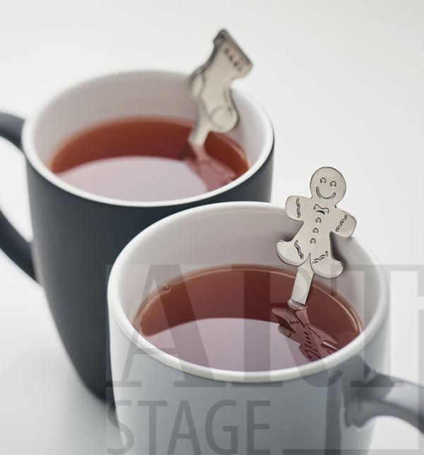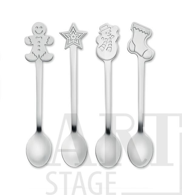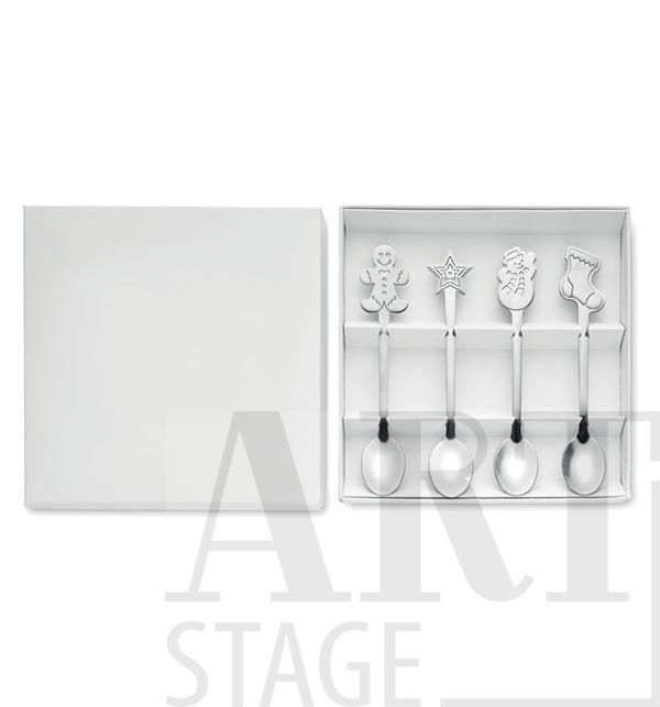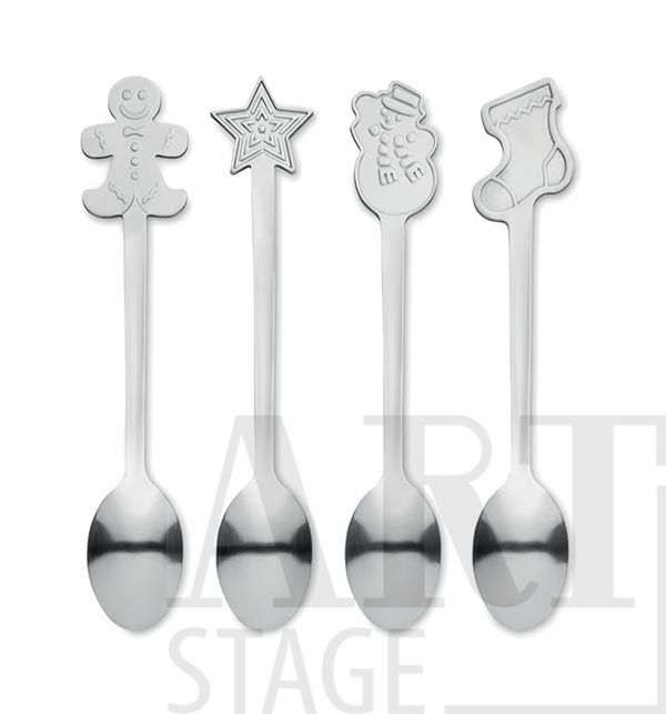 Set of 4 different stainless steel Christmas motif tea spoons. Presented in giftbox.