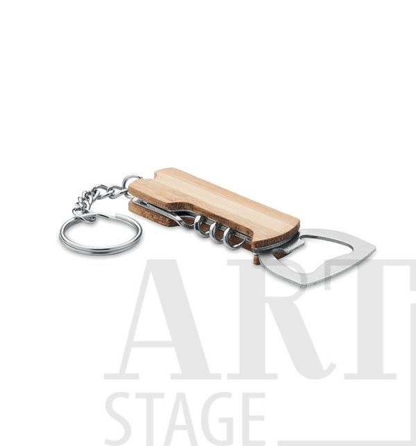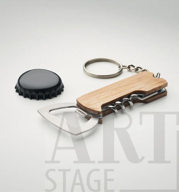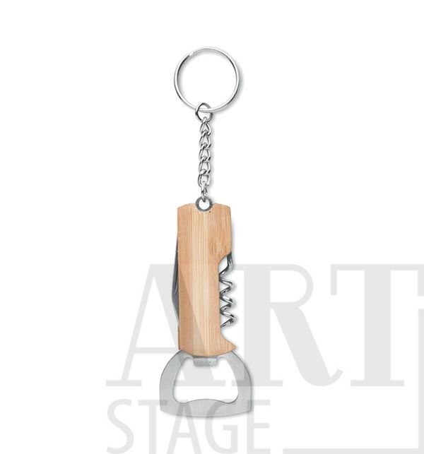 3 in 1 tool pocket with bamboo case and key ring. It includes a bottle opener, wine corkscrew opener and pocket knife.