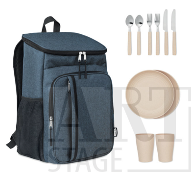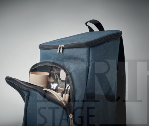 600D RPET insulated cooler bag with practical picnic accessories for two – knife, fork, spoon and cup. Suitable for picnics, camping, outdoor activities and travel. Durable, easy to carry and ideal for logo personalization, making it a great choice for corporate and promotional gifts.
