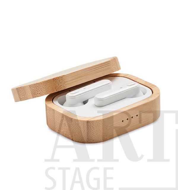 Комплект от 2 True Wireless Stereo (TWS) 5.0 слушалки в бамбуков калъф с микрофон и вградена батерия 30 mAh. Време за възпроизвеждане приблизително 3 часа. Автоматично сдвояване. Включва micro USB кабел за зареждане и зарядна станция 185 mAh. Бамбукът е естествен продукт, възможно е да има леки вариации в цвета и размера на всеки артикул, което може да повлияе на крайния резултат.