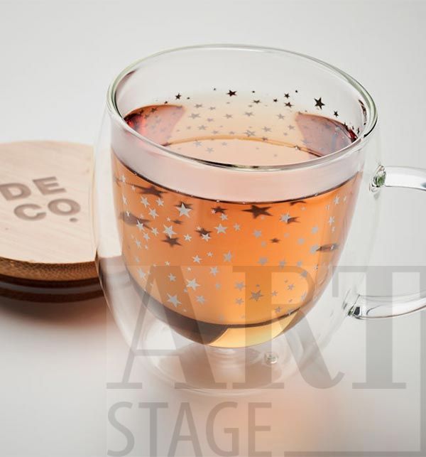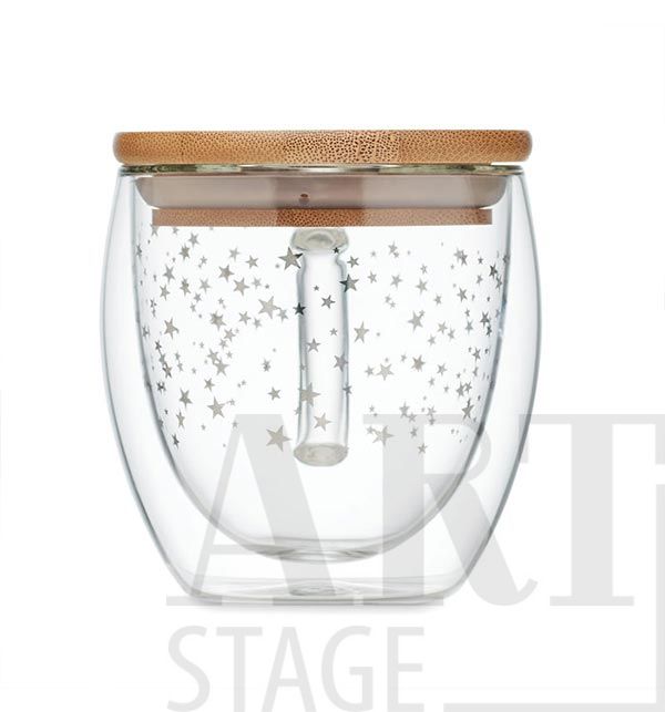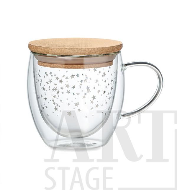 Двустенна боросиликатна чаша с дизайн от звезди и бамбуков капак. Вместимост: 220 мл. Пийте любимото си кафе или чай в тази празнична коледна чаша. Капакът от естествен бамбук може да се използва като подложка и му придава стилен вид. Боросиликатното стъкло е идеално за съхранение на горещи течности. Бамбукът е естествен продукт, възможно е да има леки вариации в цвета и размера на всеки артикул, което може да повлияе на крайния резултат от декорацията.