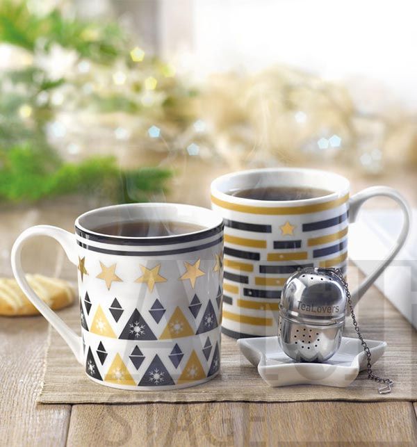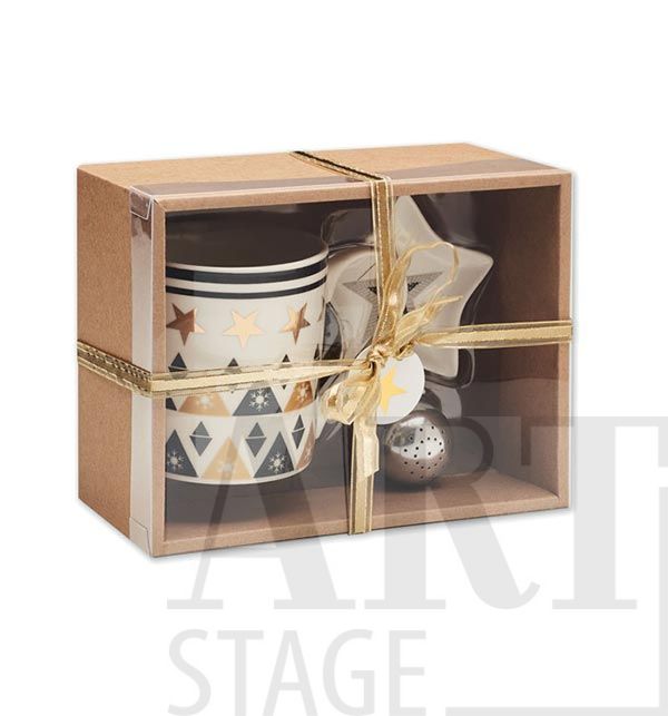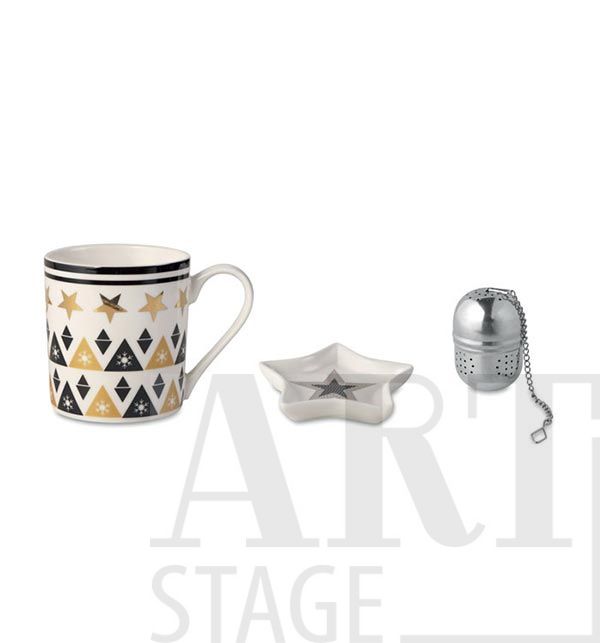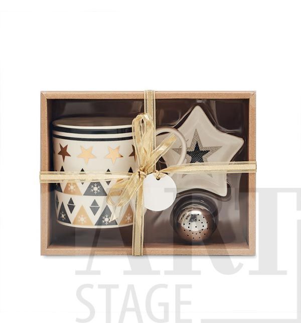 Комплект керамични чаши, включващ чаша, филтър за чай и мини чинийка. Предлага се в картонена кутия с PVC калъф и шнур с етикет.