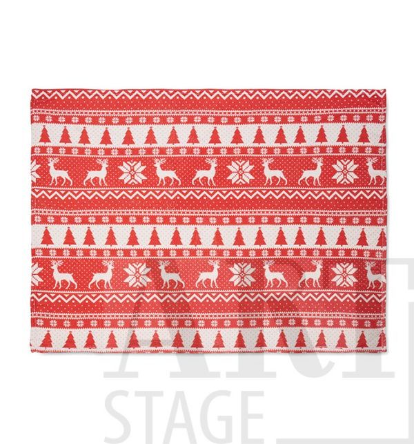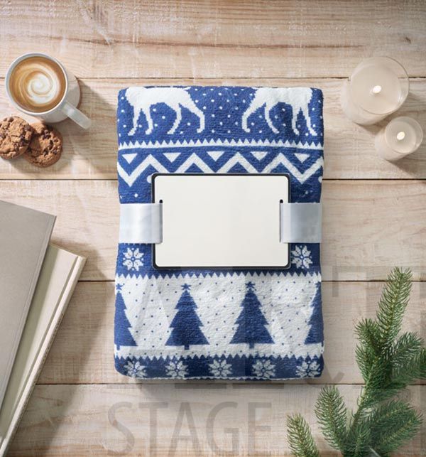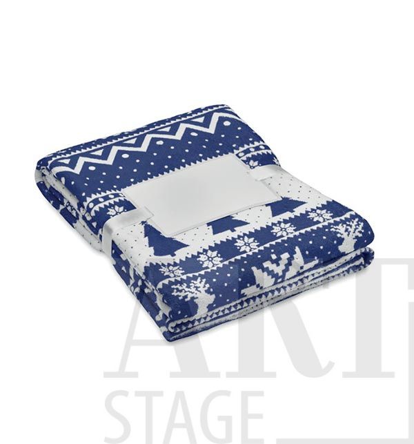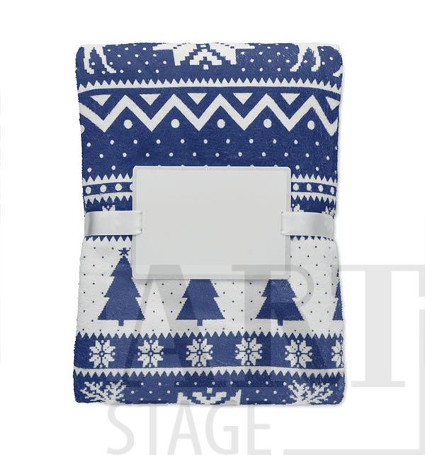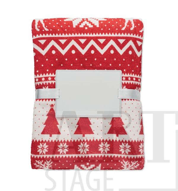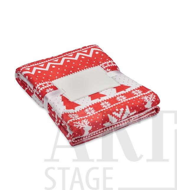 Одеяло от коралов полар RPET 190 гр/м² със зимен мотив. Опаковано в панделка и картон за печат.