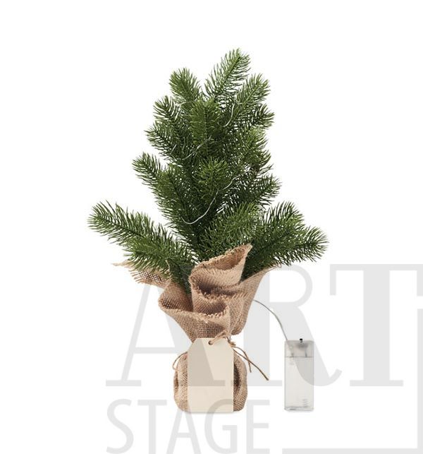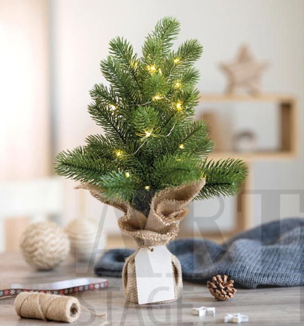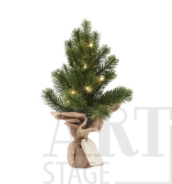 Мини изкуствена (PE) коледна елха с 20 LED лампички в топло жълто на основа от юта. Предлага се с дървен етикет за подарък. 2 AA батерии не са включени. Украсете дома или офиса си с тази малка празнична елха. Благодарение на 20-те LED лампички, тази декорация ще създаде приятна атмосфера. Тъй като е изкуствена, можете да я използвате повторно догодина.