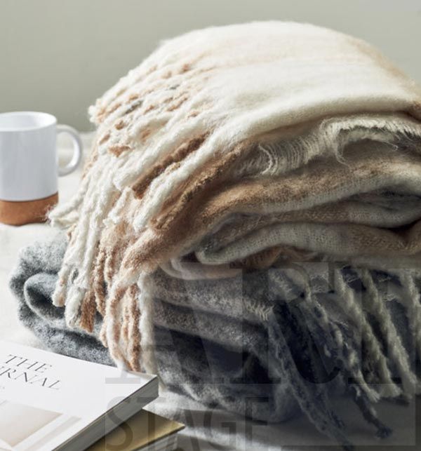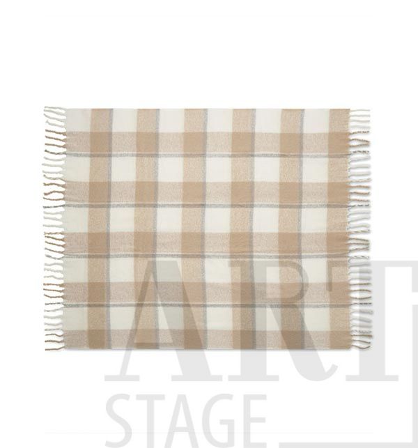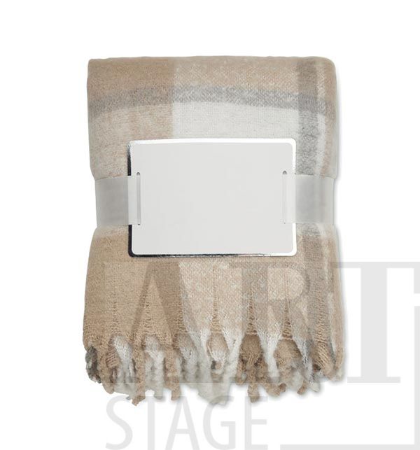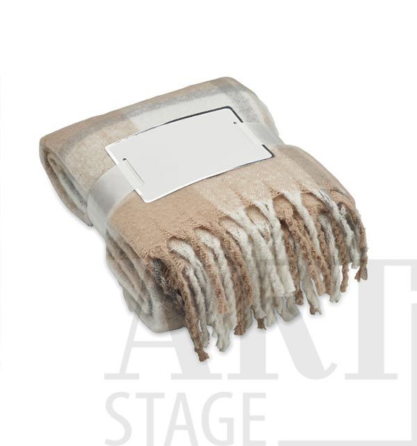 Одеяло от RPET полиестер с кариран дизайн и ръчно навити ресни. Опаковано в панделка и картон за печат.