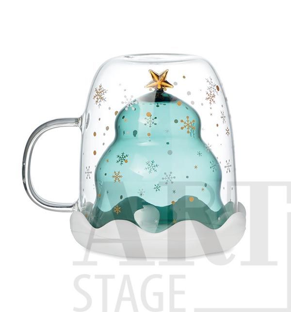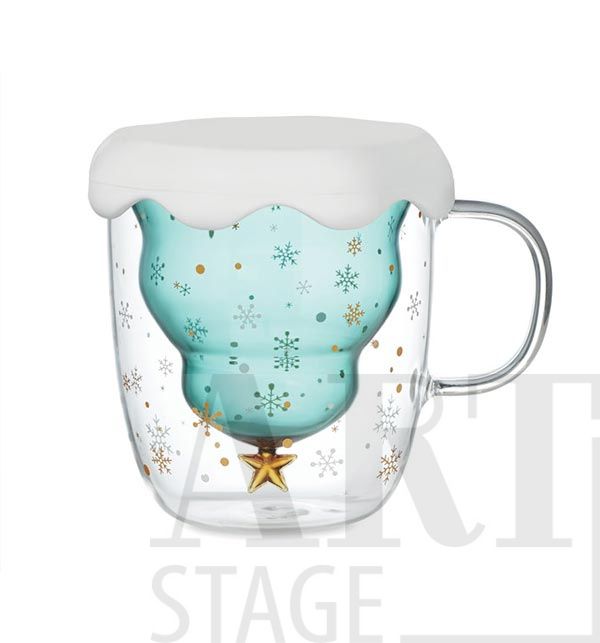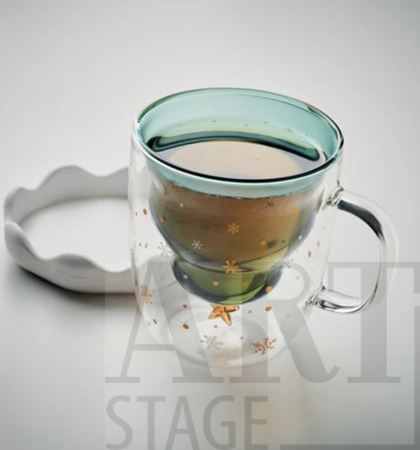 Двустенна боросиликатна чаша със сезонен дизайн, силиконов капак и подложка. Вместимост: 250 мл. Тази забавно декорирана чаша има обърната коледна елха вътре. Перфектната чаша за кафе или чай, от която да се настроите за празнично настроение по време на празниците. Боросиликатно стъкло е много по-здраво от обикновеното стъкло, което го прави идеално за горещи течности.
