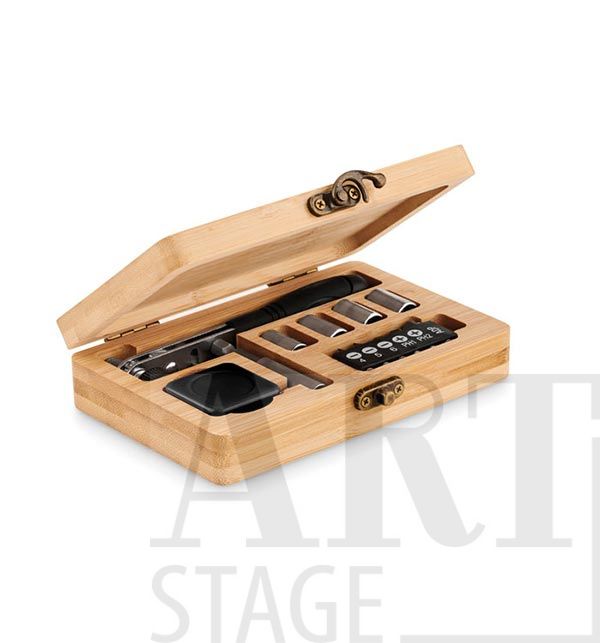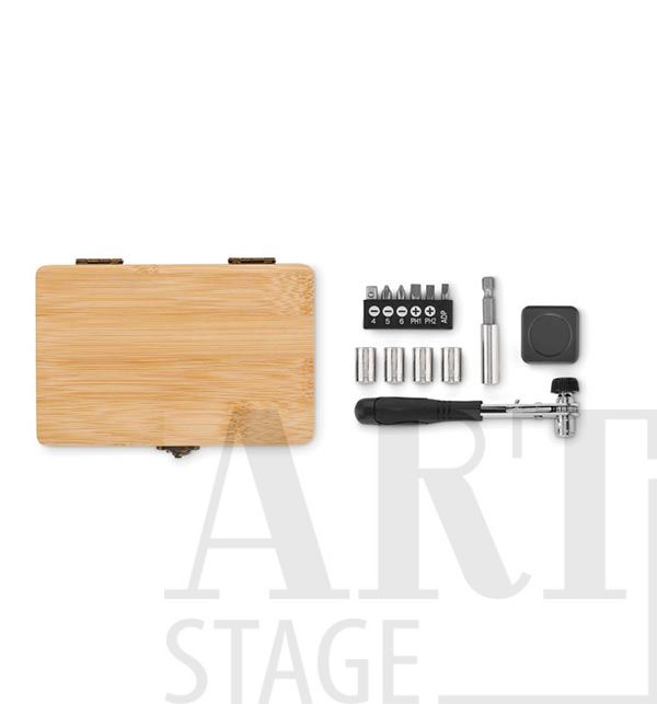 Комплект от 13 инструменти, представен в бамбукова кутия, съдържащ 6 бита в държач с: 3 размера на шлицове (4, 5, 6 мм), 2 размера Philips (PH1, PH2) и 1 адаптер, 4 вложки (7 мм, 8 мм, 9 мм, 10 мм), 1 дръжка, 1 конектор и 1 рулетка. Сертифициран по FSC® | FSC 100%, N5.7, FSC-C213206